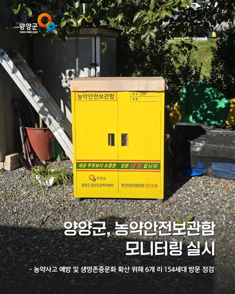 양양군 보건소 관계자는 “농약안전보관함 보급을 통해 농민들의 충동적 음독 자살을 예방하고, 지속적인 정신건강 프로그램을 병행하여 건강하고 안전한 농촌 환경 조성에 최선을 다하겠다”고 말했습니다.