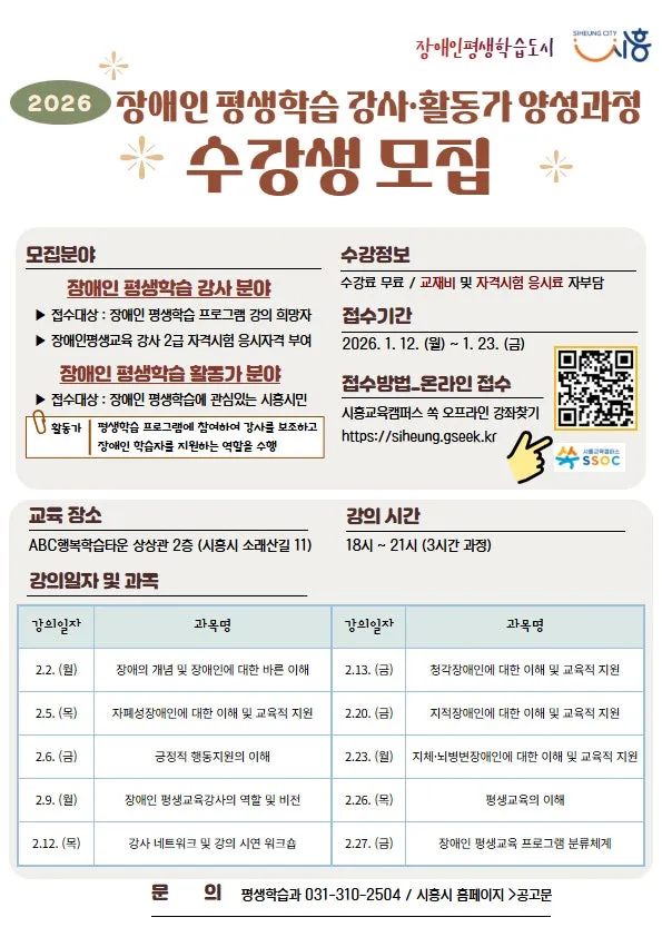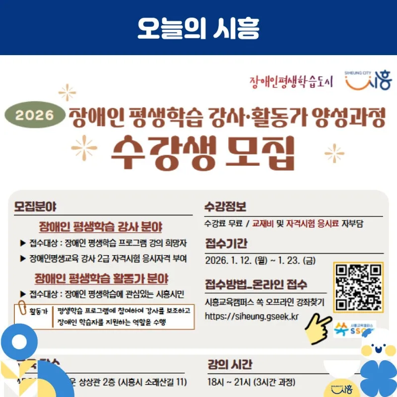 시흥시는 오는 1월 23일까지 ‘2026년 장애인 평생학습 전문 강사와 활동가 양성 과정’ 수강생을 모집합니다.