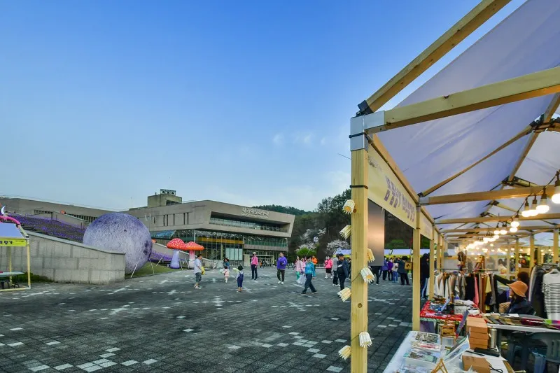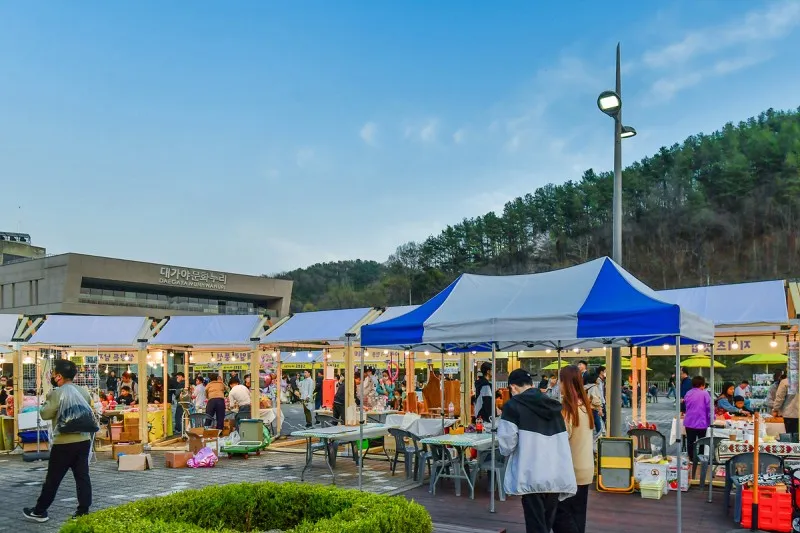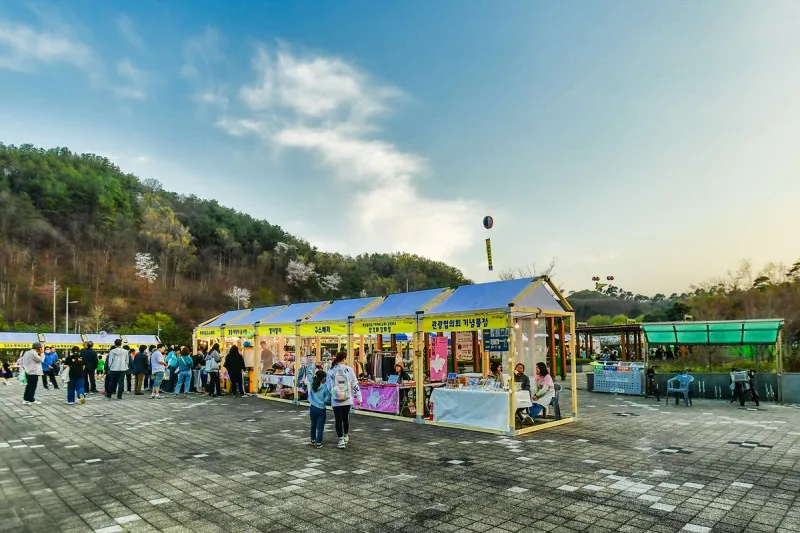 다양한 판매 부스가 설치되어 있고 많은 관광객들로 붐비고 있는 대가야 문화누리 광장입니다.