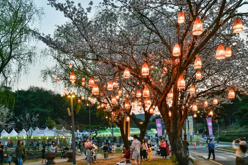 벚나무에 걸린 등에 불이 들어오자 사람들이 사진을 찍고 있습니다.