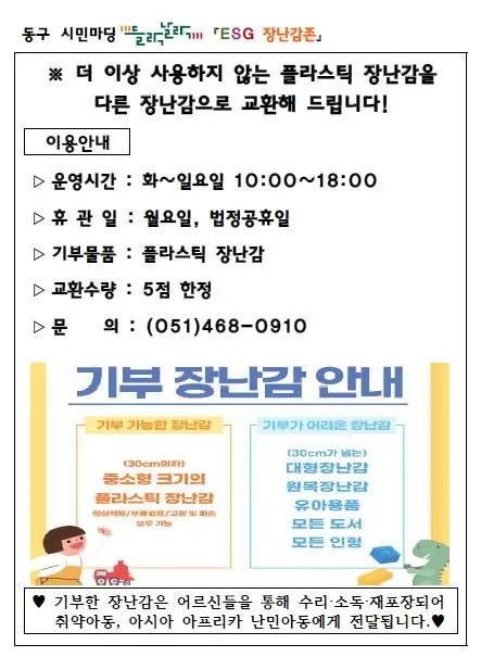 ♻️ 사용하지 않는 플라스틱 장난감을 가져오시면 새로운 장난감으로 교환해 드립니다!
