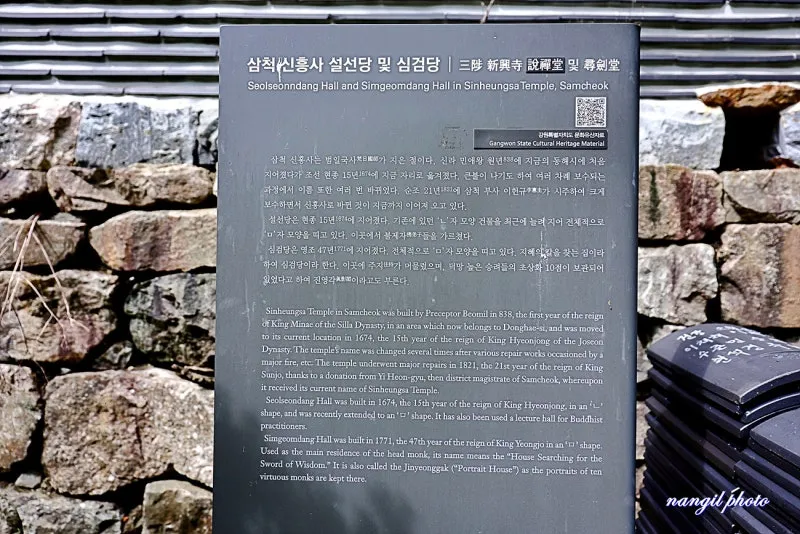 ▼ 삼척 가볼만한곳 신흥사 앞에는 넓은 광장과 2층 목조건물이 있는데 신흥사 경내로 들어가려면 학서루 건물 1층을 통과해야 하며 학서루 건물 옆에는 삼척 신흥사 설선당과 심검당 안내문에 있고 학서루를 통과하여 안으로 들어서면 돌계단 정면에 대웅전이 보이고 학서루 옆에는 종각, 좌. 우로 심검당과 설선당이 보이는데 영화 봄날은 간다에는 심검당이 나옵니다.