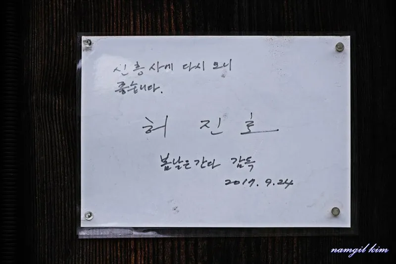 ▼ 사진은 대웅전 앞 오른쪽 심검당과 왼쪽 설선당 모습이며 세 번째 사진은 영화 봄날은 간다 촬영 감독인 허진호 감독이 영화 개봉 후 삼척을 지나다가 신흥사에 다시 들러 남긴 친필 사인으로 내가 신흥사를 처음 방문했을 때 심검당 벽에 붙여져 있어서 촬영한 사진입니다.