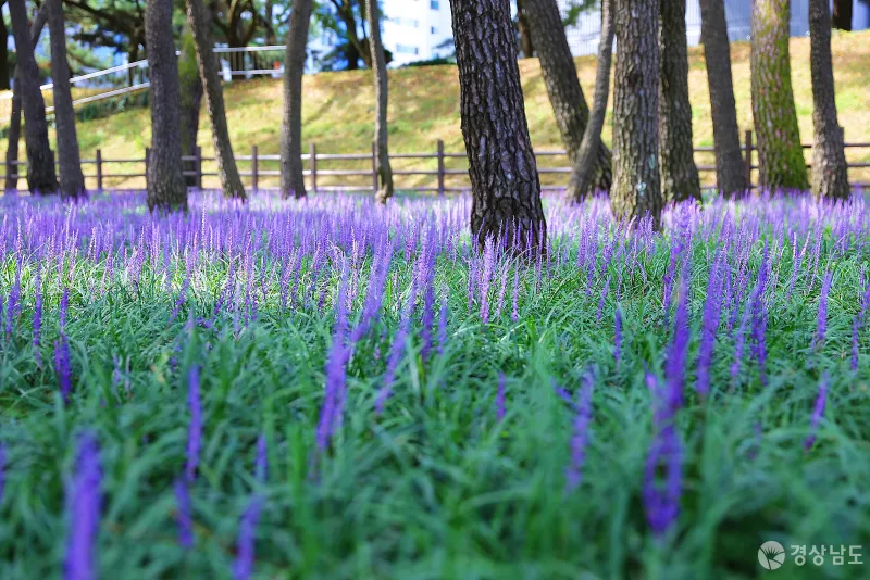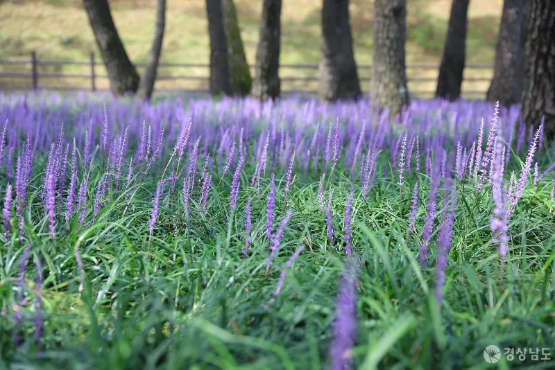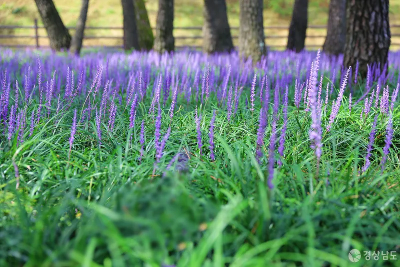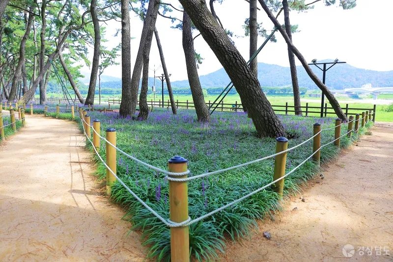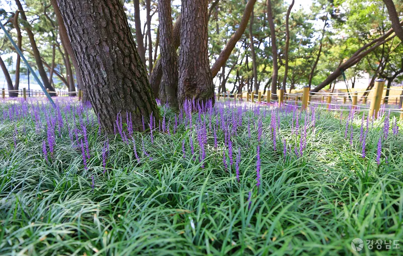 밀양 삼문동 밀양강 둔치에는 자연 소나무 군락지인 송림이 자리 잡고 있는데요. 소나무 그늘 아래 보랏빛 맥문동이 활짝 피어 산책을 즐기는 사람들의 눈을 즐겁게 하고 있습니다.
