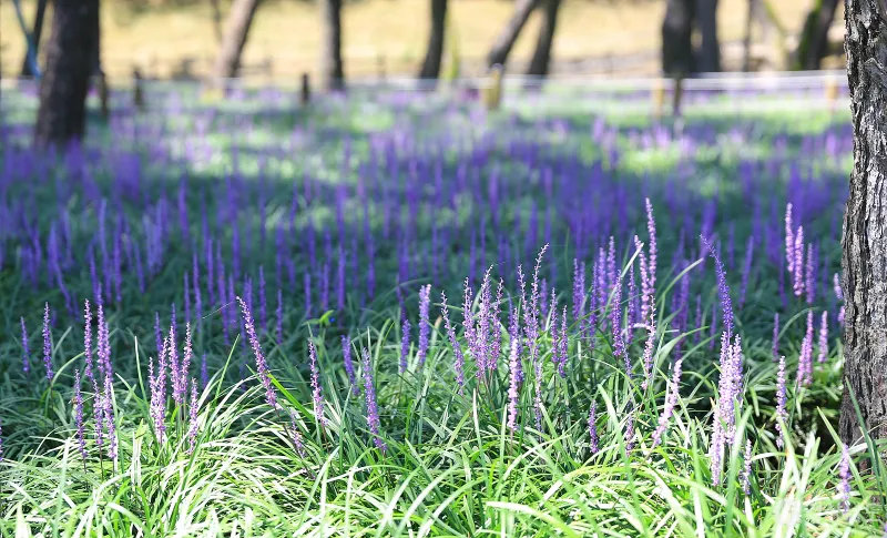 곰솔 나무 아래 보랏빛으로 피어 있는 맥문동은 자연스러운 아름다움과 낮은 자세를 강조하는 ‘겸손’, 긴 꽃 피는 기간과 겨울에도 푸른 잎을 유지하는 특성에서 ‘인내’, 꽃이 오래 피어 기쁨을 지속시킨다는 의미로 ‘기쁨의 연속’, 꽃의 반투명한 담황색 덩이뿌리가 흑진주를 연상 시키는 데서 비롯된 ‘흑진주’라는 꽃말을 가지고 있습니다.