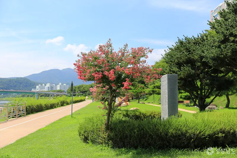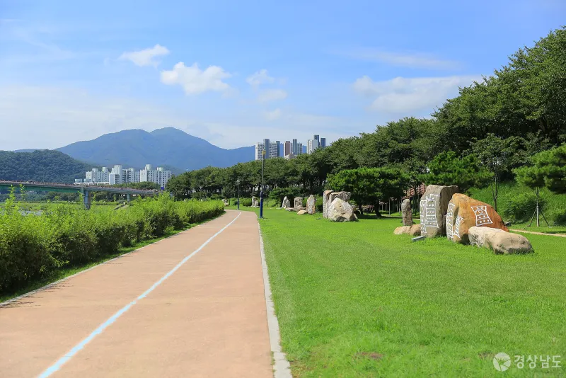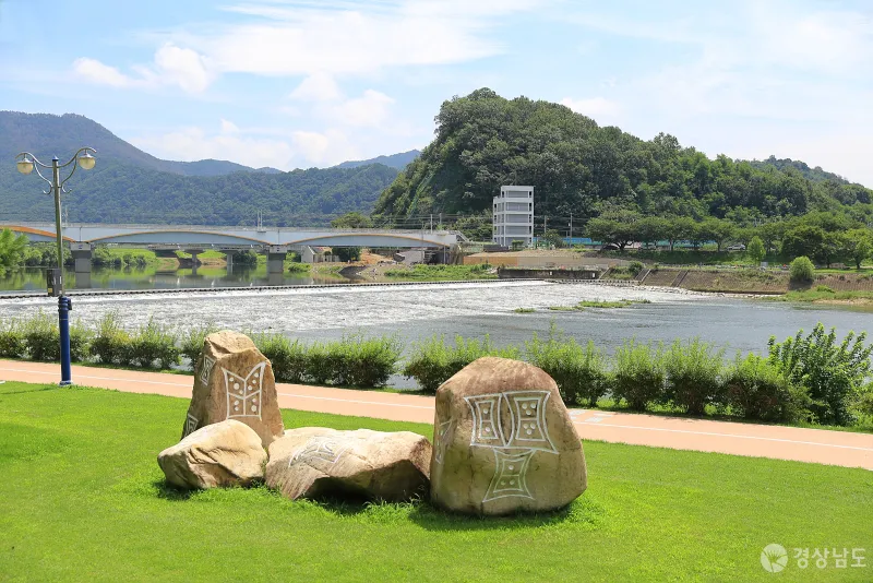 봄이면 아름다운 벚꽃길이 펼쳐지는 제방 산책길 아래로는 암각화 조각공원이 자리하고 있습니다.