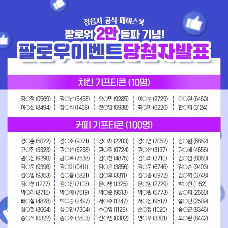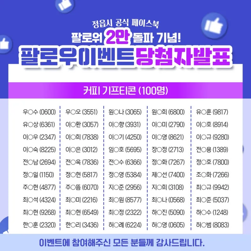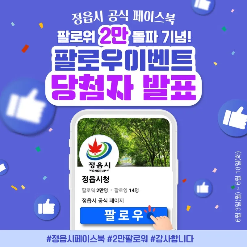 당첨자발표|정읍시 페이스북 팔로워 2만명 돌파! 이벤트