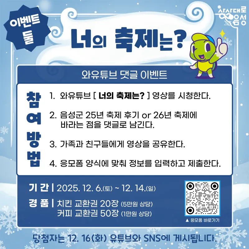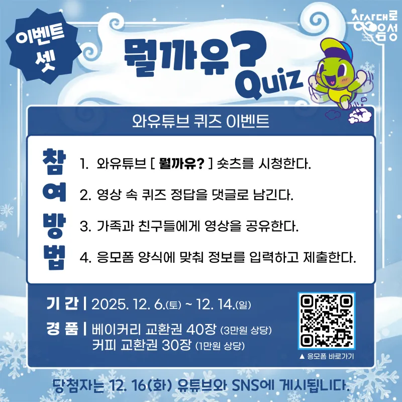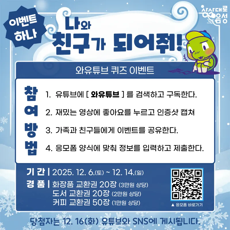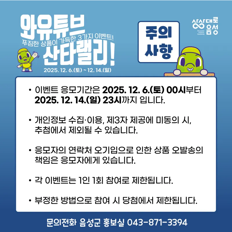 #음성군 #유튜브 #와유튜브 #이벤트 #추첨 #퀴즈 #구독 #좋아요 #이벤트산타랠리 #선물 #댓글이벤트 #퀴즈이벤트 #공유이벤트 #구독이벤트 #선물빵빵