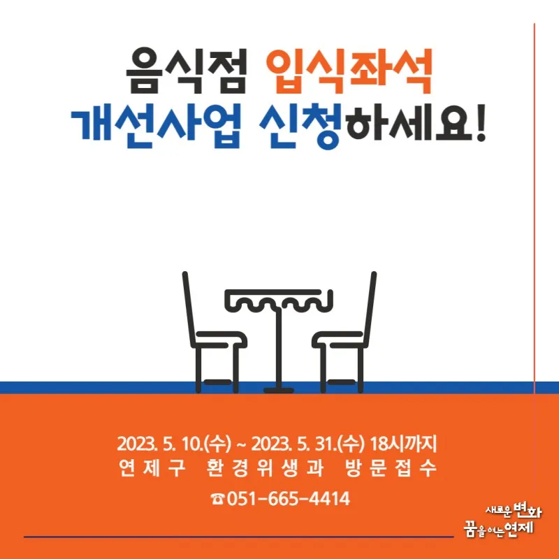 입식좌석개선 지원사업 신청업소 모집 연제구 환경위생과 ☎051-665-4414 |
