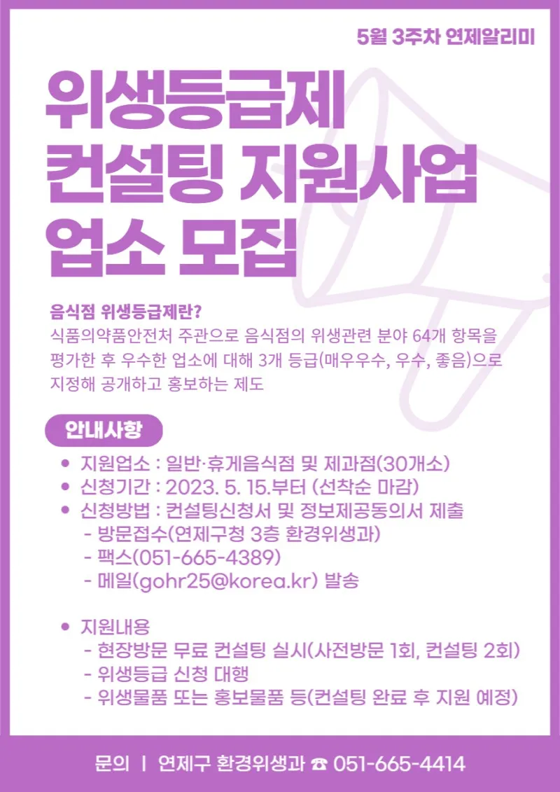 음식점 위생등급제 컨설팅 신청안내 연제구 환경위생과 ☎051-665-4414 |