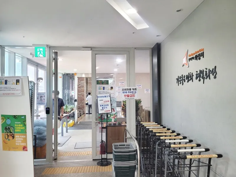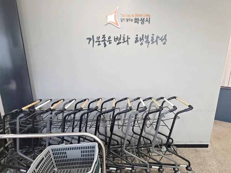 이번에 제가 방문한 곳은 동탄호수점인데요, 동탄호수공원 어울림센터 건물에 있습니다. 동탄호수공원과 인접해 있어서 장을 보고 산책하기에도 좋은 곳이랍니다. 로컬푸드 직매장 옆에 노인복지회관도 있어서 직매장은 늘 북적이고 있답니다. 매장 입구에 장바구니 카트와 장바구니가 있어 장을 보기 편리합니다.