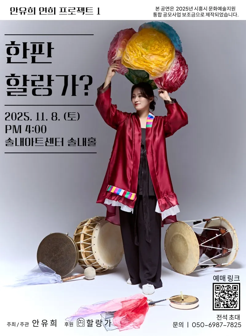 2025 시흥시문화예술지원사업 선정작 안유희 연희 프로젝트 1 <한판 할랑가?>에 여러분을 초대합니다. 이 공연은 객석과 무대의 경계를 허물고 공연자와 관객은 서로의 박수와 눈빛을 주고받으며 어느새 한자리에 웃고, 외치고, 박수 치며 함께 노는 시간입니다. 무겁지 않게, 어렵지 않게, 그냥 한판 즐기듯 놀러 오세요! ✔️공연 안내 - 공연명 : 한판 할랑가? - 일시 : 2025년 11월 8일 (토) 오후 4시 - 공연 장소 : 솔내아트센터 (호현로 42-8 3층 솔내아트센터) *극장 내 엘레베이터가 없습니다.* - 주차 안내: 주...