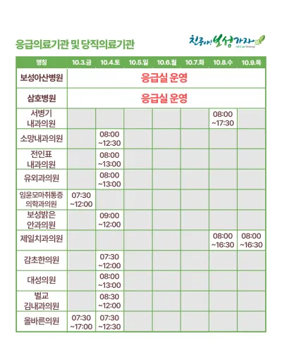 추석 연휴에도 군민의 안전을 위해 일부 의료기관과 약국이 문을 엽니다.
