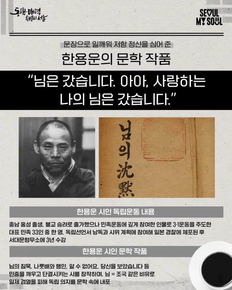 문장으로 일깨워 저항 정신을 심어 준 한용운의 문학 작품 |