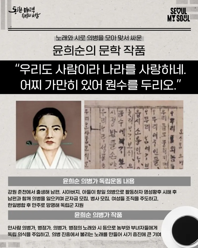 노래와 시로 의병을 모아 맞서 싸운 윤희순의 문학 작품 |