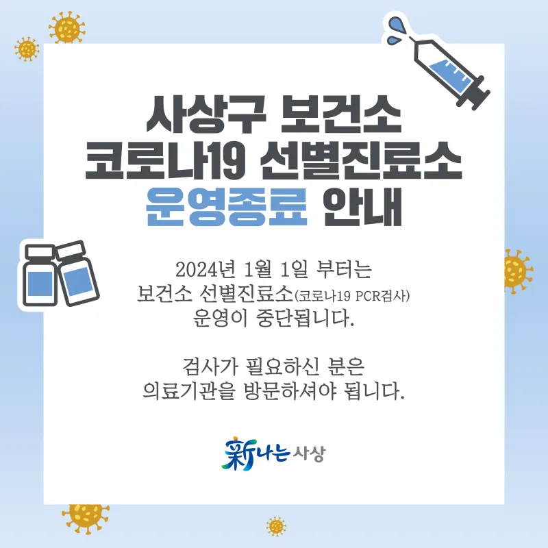 2024년 1.1. 부터는 보건소 선별진료소(코로나19 PCR검사) 운영이 중단됩니다.