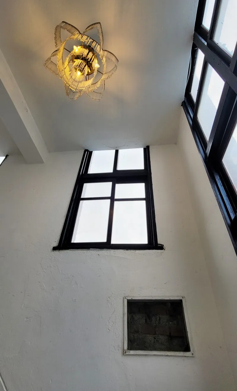 계단 위 천장에도 샹들리에가 있습니다. 한쪽 벽에는 건물을 리모델링하기 전 초기의 모습을 볼 수 있도록 해놓았습니다.