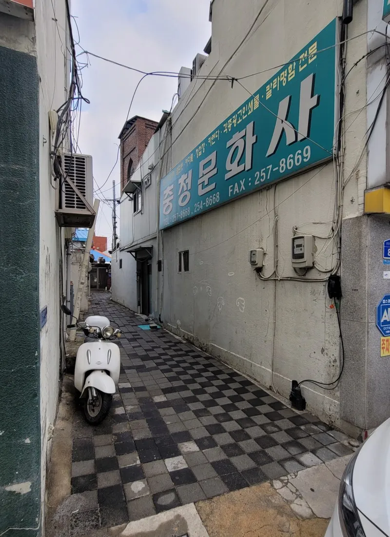 잘 모른다면 찾지 못하고 지나갈 수 있을 정도인데, ‘충청문화사’ 옆 골목으로 쑥 들어가면 생각하지도 못한 건물이 눈 앞에 모습을 드러냅니다.