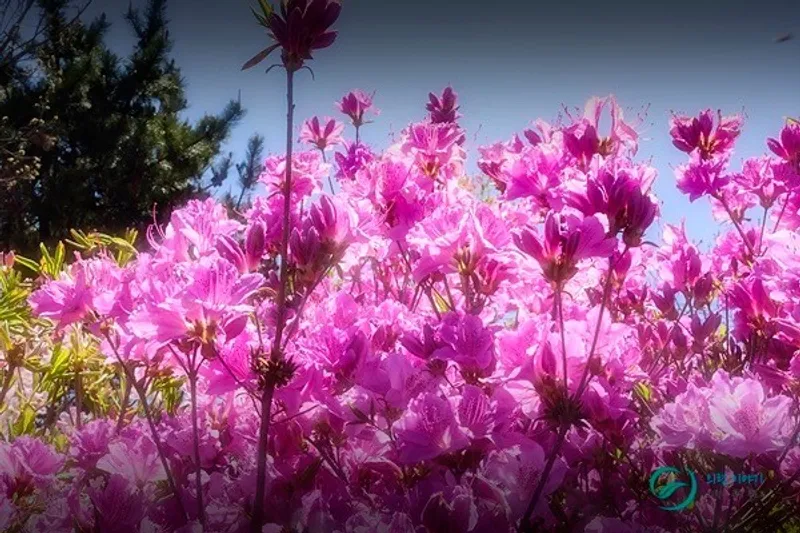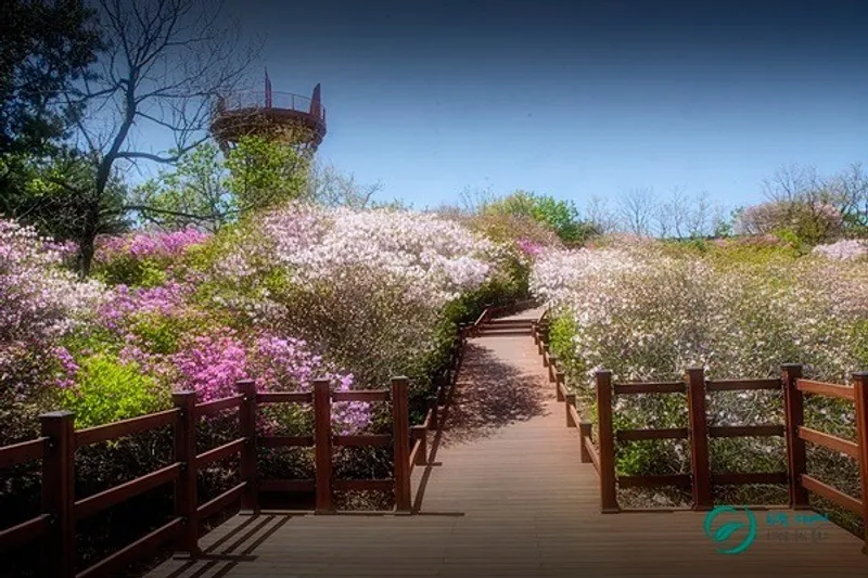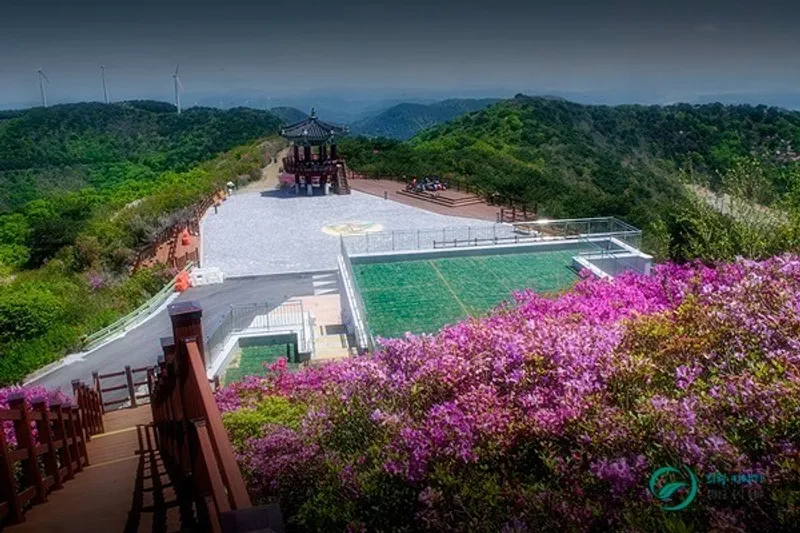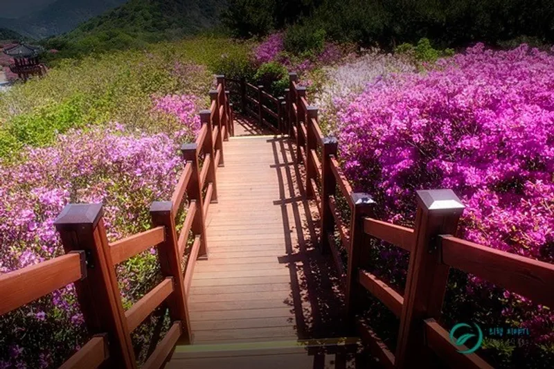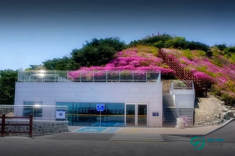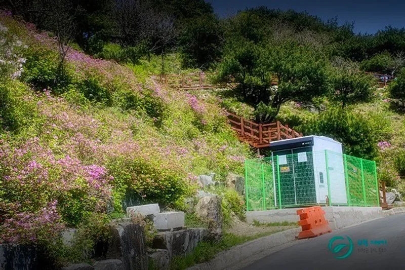 한우산 생태숲 홍보관과 한우산 팔각정 사이에 한우산에서 사용하는 전기를 관리하고 제어하는 시설이 있고 주변에 새로 시설한 테크로드 주변에 철쭉이 만개하였습니다.