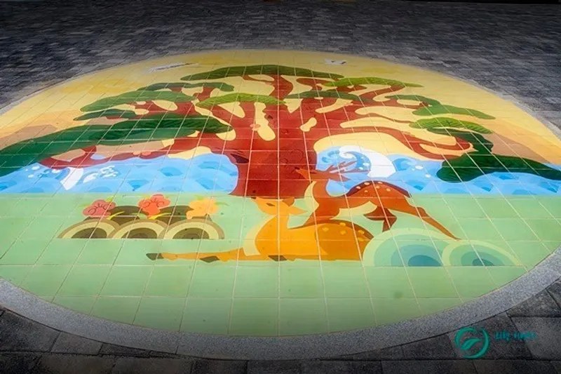 팔각정 한우정이 있는 광장 바닥에 벽화가 그려져 있습니다. 홍의송원의 가지가 많이 있는 소나무와 그리고 철쭉과 사슴 등 한우산에서 살아가고 있는 동물이 그려진 상징적인 그림입니다.