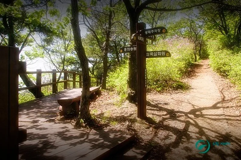 한우산 능선을 따라 산에서 내려오니 중간에 다시 홍의송원으로 향할 수 있는 테크로드가 나 있습니다.