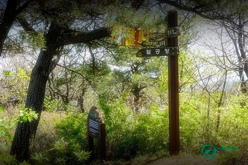 한우산을 내려오며 고개를 들어 앞을 바라보니 자굴산 중턱에 힐링 공간을 만들어 놓은 곳이 보입니다.