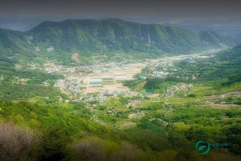 자굴산과 한우산이 사방으로 둘러싸 있고 남쪽으로만 열려 있는 가례면 갑을리 주거지와 농지가 아늑하게 보입니다. 산골짜기의 농지는 경지정리가 되어 바둑판 같은 모양을 한 모습이 자연스럽지는 않아도 편리해 보이기는 합니다. 한우산 철쭉 산행을 마무리합니다.