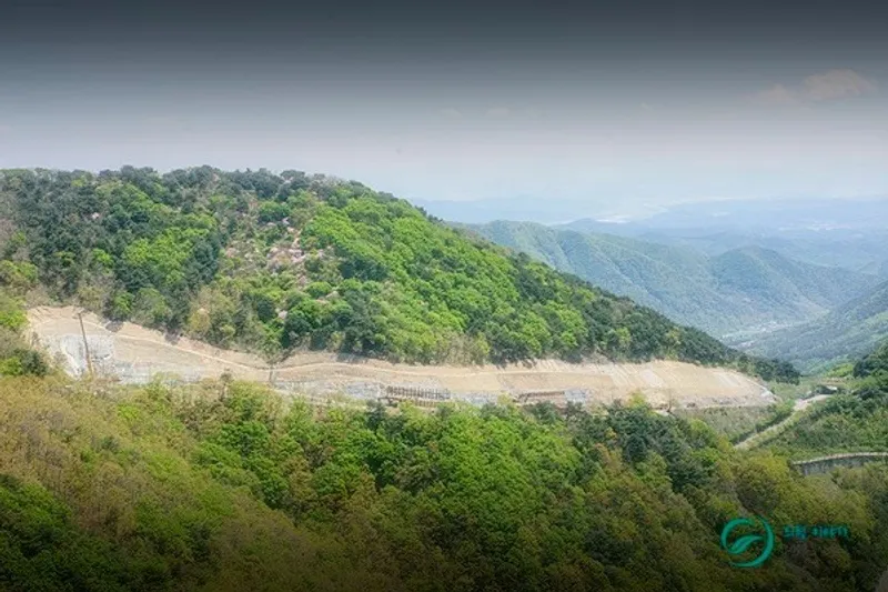 한우산으로 오르는 도로를 안전하게 확보하고 산의 무너짐으로 인한 재해를 예방하는 공사가 대형 중장비를 이용하여 대대적인 토목 공사가 진행되고 있습니다. 쇠목재에서 등산로로 가야 하지만 공사장 취재 하기 위해 찻길로 한우산에 올랐습니다.