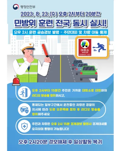🚨 국가 안보의식 고취와 국가 대응역량강화를 위한 2023 을지연습 연계 공습대비 민방위 훈련이 8월 23일(수) 14:00~14:20(20분간)까지 실시됩니다 🚨