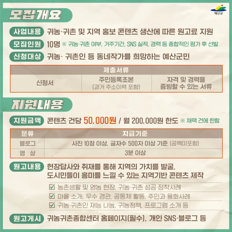 귀농 · 귀촌 및 지역 홍보 콘텐츠 생산에 따른 원고료 지원