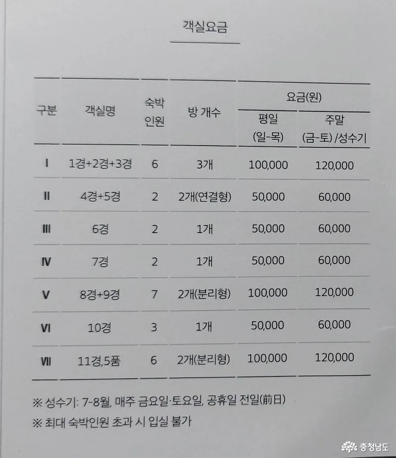 이곳의 객실요금도 숙박인원에 따라 다르지만, 비싼 편은 아닌 것 같네요. 2명이 이용할 경우 평일 50,000원(주말 60,000원)이고 6명 기준 방 3개를 이용할 수 있는 객실은 평일 100,000원(주말 120,000원) 정도라 큰 부담 없이 이용할 수 있을 것 같았습니다.