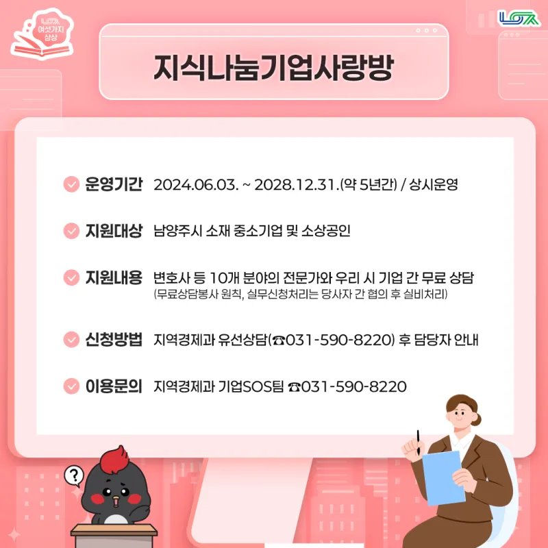지식나눔기업사랑방은 남양주시 소재 중소기업 및 소상공인을 위한 무료 상담 서비스로, 신청 시 변호사, 변리사, 회계사, 세무사 등 10개 분야의 전문가와 상담할 수 있는 정책입니다. 지역경제과로 유선 상담 및 신청서를 접수한 후 자문 위원과 연결하여 상담할 수 있도록 하는데요, 기업 및 사업 운영과 관련해 전문가와의 상담이 필요하시다면 지식나눔기업사랑방 서비스를 이용해 보세요!