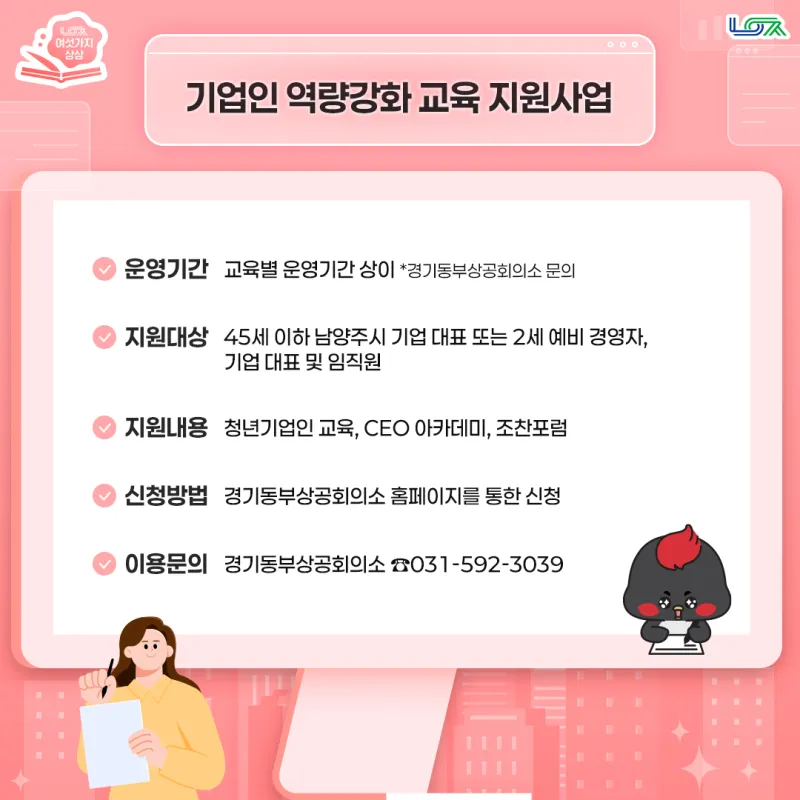 남양주시 기업인의 역량 강화를 위한 다양한 교육 또한 지원하고 있는데요, 45세 이하의 지역 기업 대표 또는 2세 예비 경영자를 위한 청년기업인 교육부터 CEO 아카데미, 조찬포럼 등을 지원합니다. 각 교육별 운영 기간이 다르니 경기동부상공회의소 홈페이지를 통해 교육 및 신청에 대한 자세한 내용 확인해 보세요!