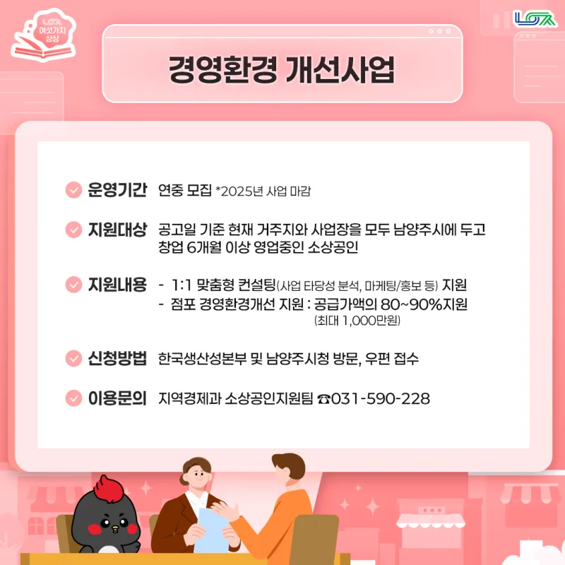 거주지와 사업장을 모두 남양주시에 두고 창업 6개월 이상 영위 중인 소상공인을 위한 사업으로 컨설팅, 점포 경영 환경개선 등을 지원하는 사업입니다. 상권 및 입지분석이나 마케팅/홍보, 원가 절감, 경영진단 등 소상공인에게 필요한 1:1 맞춤형 컨설팅 지원과 위생관리, 안전 관리, 홍보 등 점포 경영 환경개선을 위한 공급가액의 80~90%(최대 1,000원)를 지원합니다!