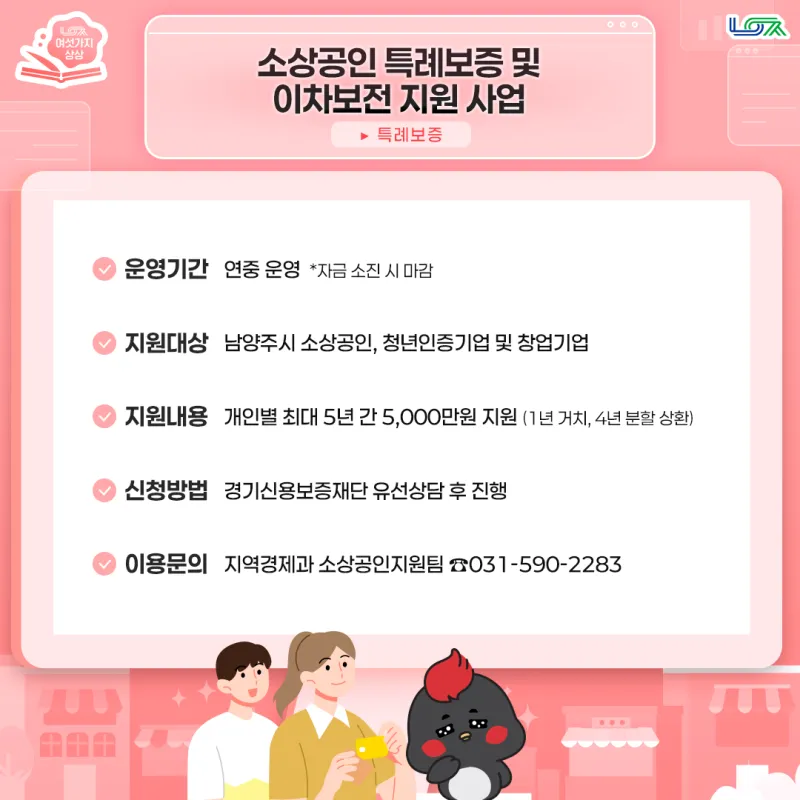 소상공인의 경영안정을 위하여 남양주시는 소상공인 특례보증 및 이차보전 지원사업을 운영하고 있습니다. 남양주시 소상공인과 청년 인증기업 및 창업기업을 대상으로 최대 5년간 5,000만 원을 지원하고 연 2% 이내 대출이자를 지원하는데요, 매년 2월부터 자금 소진 시까지 신청을 받으니 궁금한 점은 지역경제과 소상공인지원팀에 문의해 주세요!