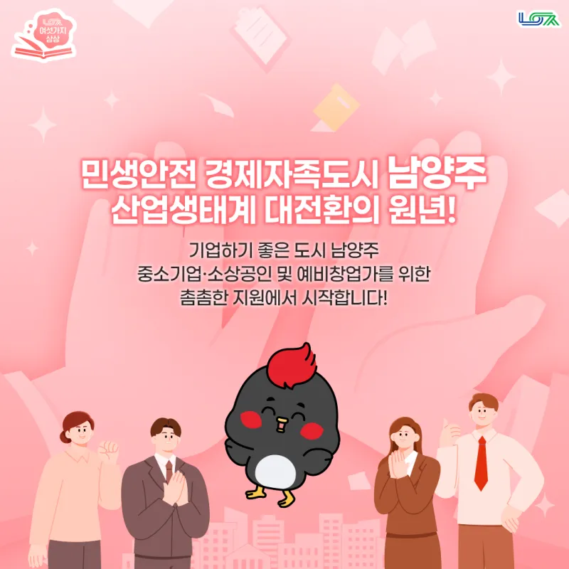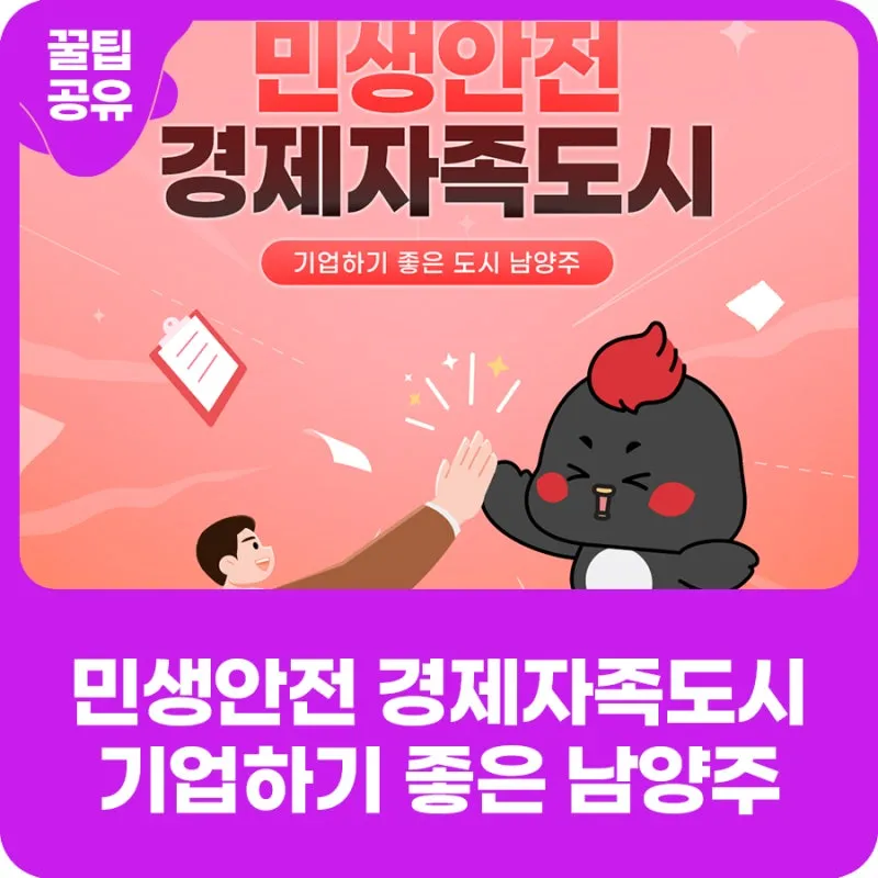 상상 THE 이상의 남양주를 만들기 위해 체계적인 정책을 펼치고 있는 남양주시! 오늘은 기업과 소상공인을 위한 지원 정책 등이 가득 담긴 민생안전 경제자족도시 남양주의 모습을 소개해 드리려고 합니다. 창업에서부터 실질적인 기업 운영까지, 기업하기 좋은 도시 남양주를 만들어가고 있는 정책들은 무엇인지 크크가 설명해 준다고 해요~ 지금부터 함께 만나볼까요?