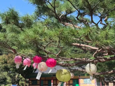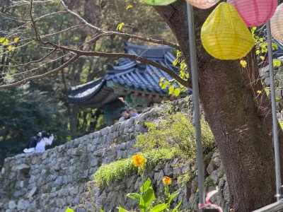 사찰 앞 벤치에 앉아 쉬어가는 사람들 간식 먹는 가족들 사진 찍는 커플들이 가득했고
