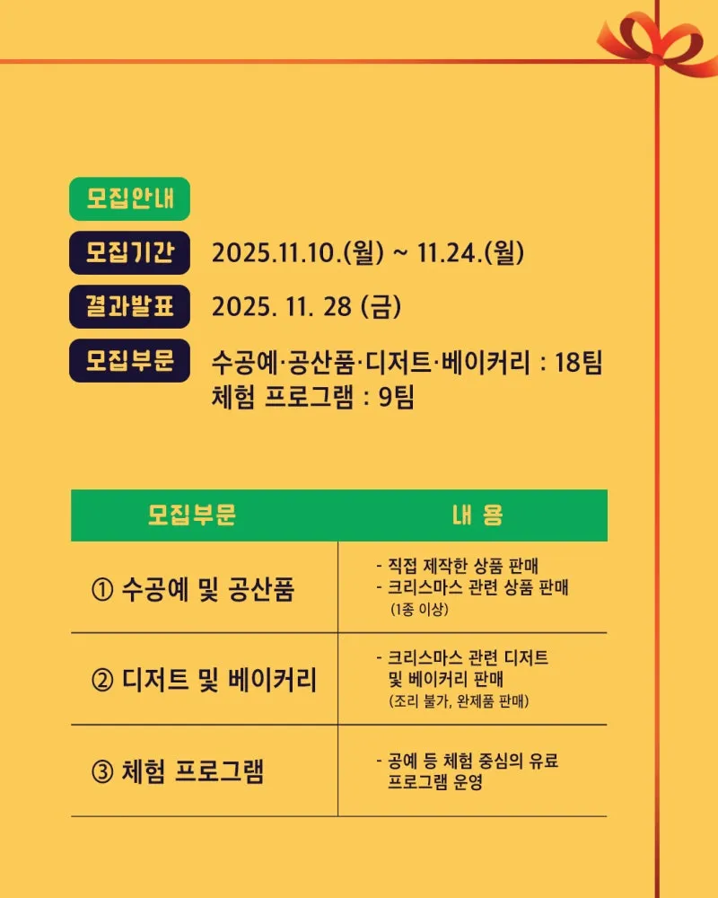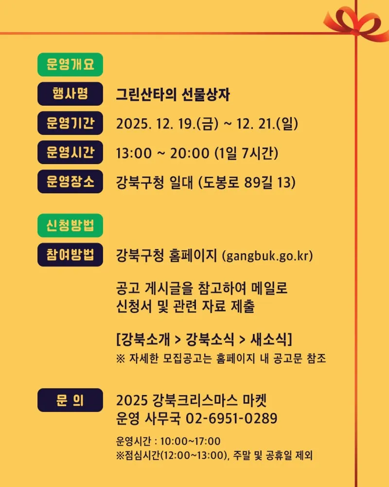 2025 강북 크리스마스 마켓 「그 린산타의 선물상자 」 에서 크리스마스 감성 가득한 상품과 체험을 선보일 참여 상인을 모집합니다! ○ 신청 기간: 2025. 11. 10.(월) ~ 11. 24.(월) ○ 모집대상: 강북구 관내 소상공인 총 21팀 - 수공예·공산품·디저트·베이커리 18팀 - 체험프로그램 9팀 ○ 운영기간: 2025. 12. 19.(금) ~ 12. 21.(일) 3일간, 13:00~20:00 ○ 운영장소 - 수공예·공산품·디저트·베이커리: 강북구청 광장 - 체험프로그램: 강북구청 1층 ○ 신청방법 ...