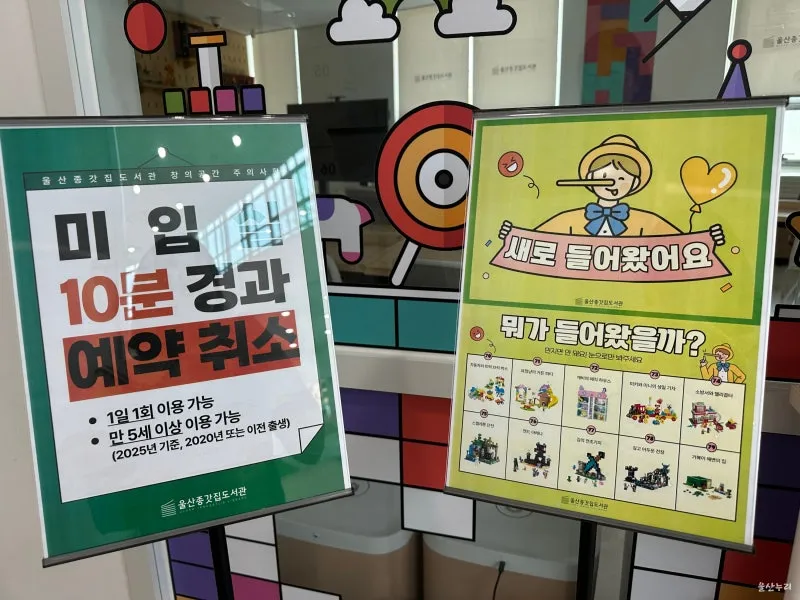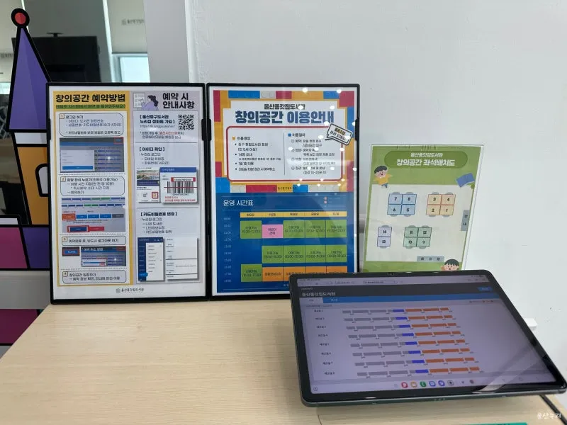 울산종갓집도서관에서 아이들에게 제일 인기가 많은 창의공간은 레고 블록을 가지고 놀 수 있는 공간으로 예약 방법은 당일 현장접수로 창의공간 입구에 있는 태블릿으로 접수할 수 있어요.