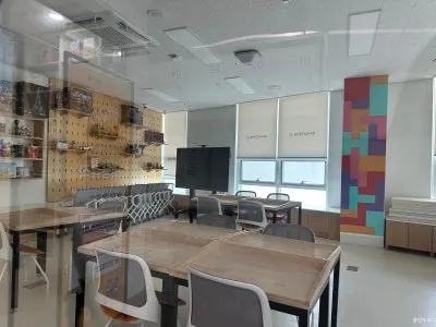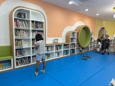 아이들이 이용하는 공간이라 푹신한 매트와 앙증맞은 사이즈의 의자와 책상들로 채워져있어요.