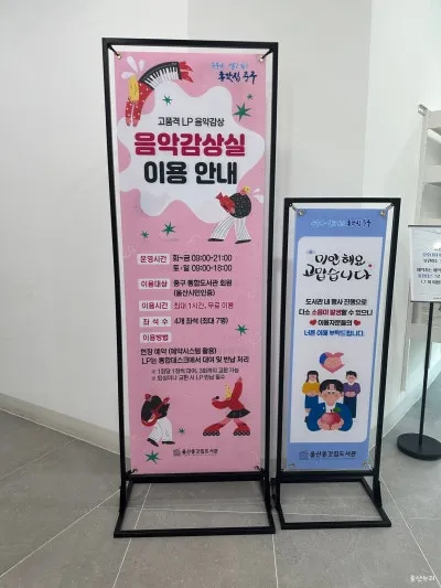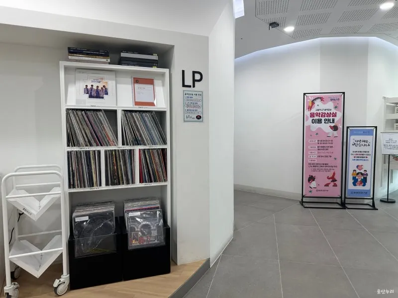 울산 실내 가볼 만한 곳 울산종갓집도서관 1층에는 최대 1시간 무료로 이용 가능한 LP음악감상실과 1회 3시간 대관료 2만 원에 이용 가능한 악기연습실과 1회 2시간 대관료 1만 원에 이용할 수 있는 소모임실까지 다양한 문화공간까지 준비되어 있답니다.