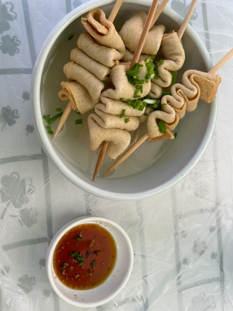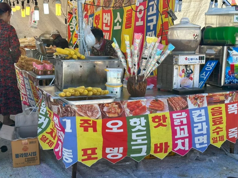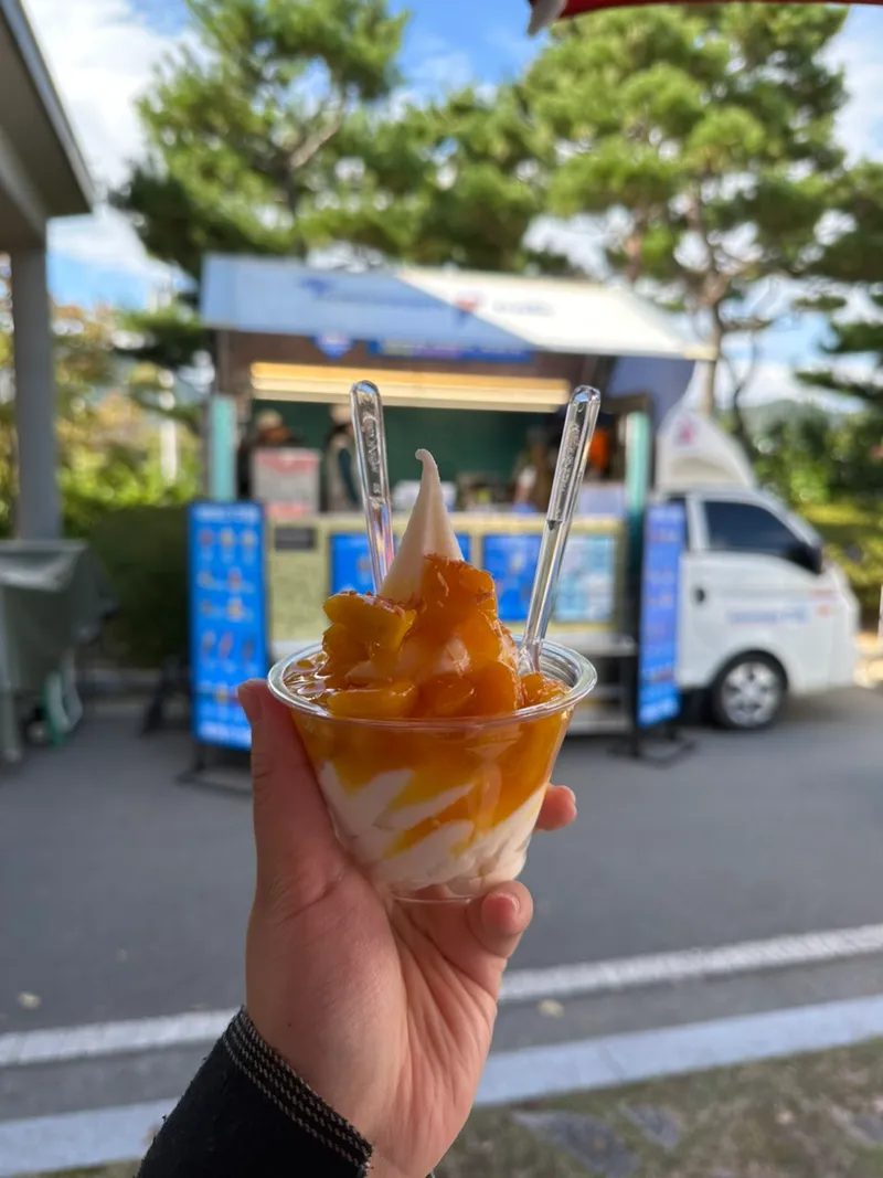 아이스크림, 닭꼬치, 피자 등을 팔고 있는데 저는 망고 아이스크림을 사 먹었습니다.