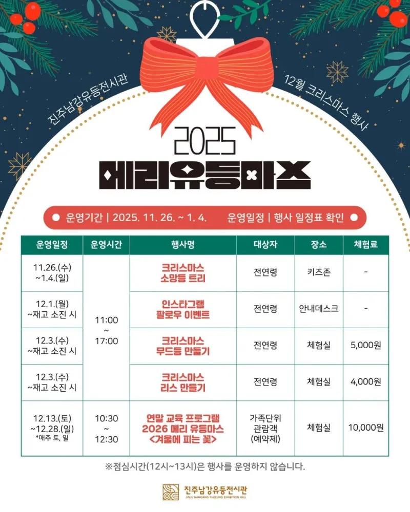 ???? 2025 메리유등마스 ✅ 일정 : 2025. 11. 26. 2026. 1. 4. ✅ 장소 : 진주남강유등전시관 로비 ✅ 행사내용 ???????? 크리스마스 포토존 설치