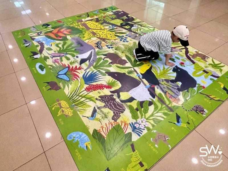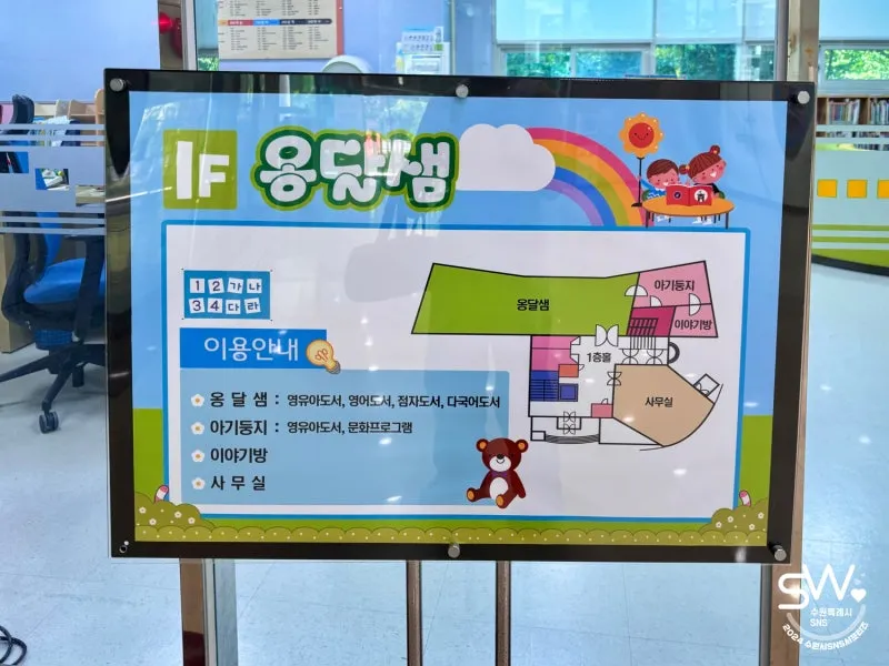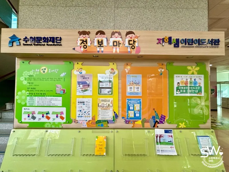 수원 아이와 함께하기 좋은 지혜샘도서관의 문을 열자마자 반겨주던 수원의 마스코트 수원이! 귀여운 포토존이 마련되어 있어 아이 사진도 찍어주었고 1층 바닥 타일에 다양한 동물들이 가득해 아이가 더욱더 흥미를 보였습니다. 정보마당코너에는 지혜샘도서관의 다양한 일정들이 게시되어 있어 참고할 수 있었어요!