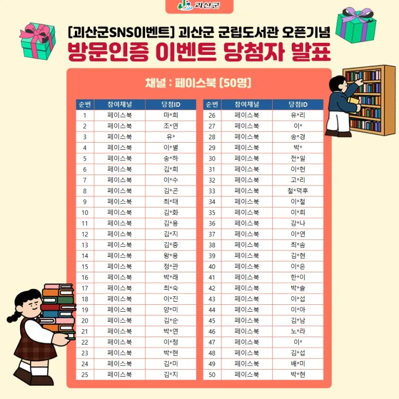 [괴산군립도서관 개관기념 SNS 방문인증이벤트] 당첨자 발표
