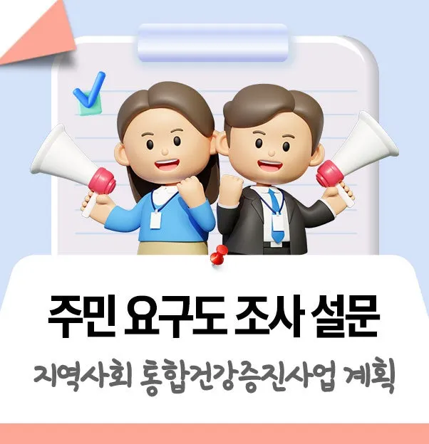 지역사회 건강 수준 향상, 만성질환 예방 및 조기 관리 등 주민 맞춤형 건강관리 사업 계획에 활용하고자 실시하는 설문조사로 주민 여러분의 많은 관심과 참여 바랍니다.