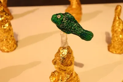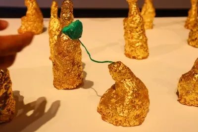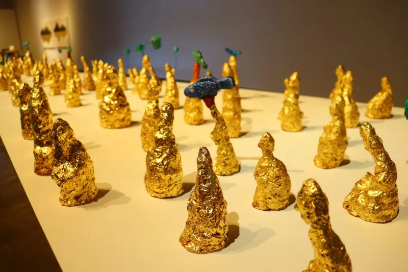 인간에게 가장 소중한 금 세 가지는 ‘황금, 소금, 지금’이라고 합니다. 무작위로 만들어진 108개의 금박 조형물은 108번뇌를 상징하고 있는데요, 작가에게도 유독 애착이 가는 금 조형물 하나가 있습니다. 바로 머리에 연을 매달고 있는 조형물인데요, 모든 것을 포용한다는 의미를 담아냈습니다.