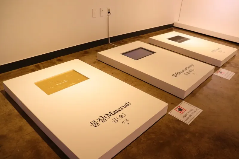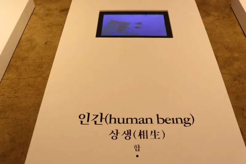 자리를 잠시 옮겨 바닥에 놓여 있는 작품으로 가보았습니다. <물질, 인간, 자연>이라는 작품인데요, 작가는 우리가 살아가는 삶을 영상으로 제작했습니다. 편견을 깨고 꼭 벽에 걸지 않아도 작품을 배려다 보고 몰입할 수 있으니 자유롭게 관람하기 좋습니다.