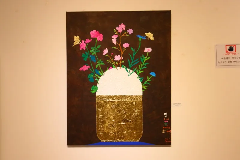 입구 쉼터에서 본 ‘상생 합-밥’ 시리즈 작품을 이곳에서 만났습니다. 작가는 15년 동안 금을 소재로 해 작품을 만들고 있는데, 풍요로운 밥상 또한 밥그릇에 금이 가득합니다. 옻칠만 5번 했을 정도로 손이 많이 간 작품이지만 작가는 풍요로움과 넉넉한 인심, 여유를 작품에 담아내고 있습니다. 지친 현대인에게 고봉 가득한 쌀밥은 즐거운 위안이자 상생의 이미지입니다.
