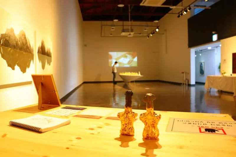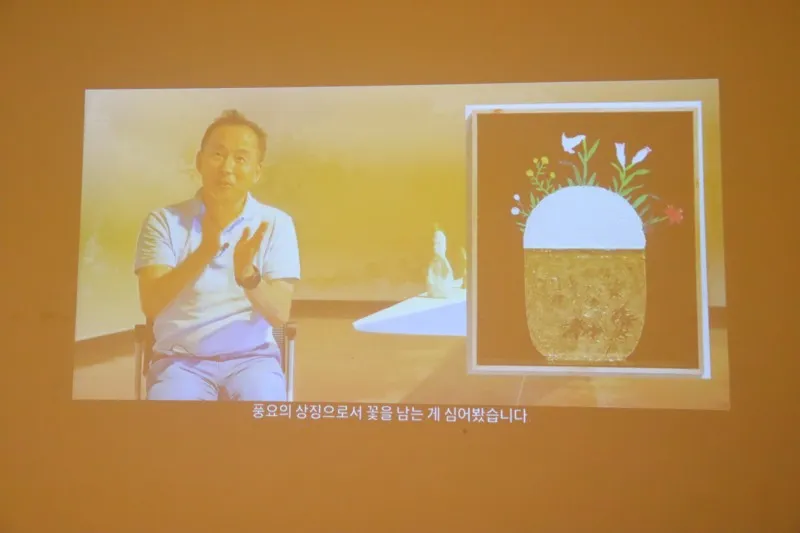 전시관 벽면에서는 빔을 통해 전해지는 작가의 영상이 쉴새 없이 이어집니다. 이번 전시의 메인은 특별한 개금 작업(닥나무로 만든 두꺼운 한지에 그림을 그린 후 순금박을 얇게 펴서 붙이는 일)을 통한 조형물로 생소한 작품이라 작가의 설명에 더 귀 기울이게 됩니다.